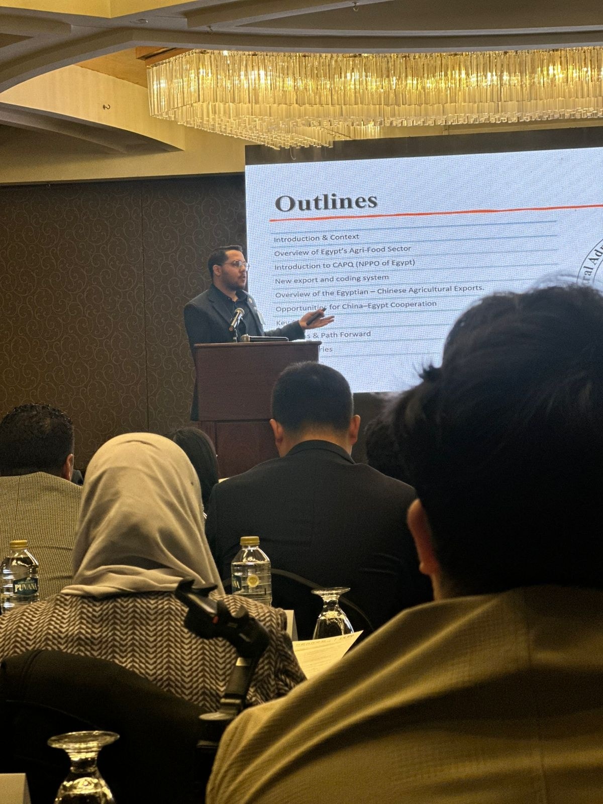 وتناول العرض عددًا من المحاور، من بينها التعريف بالقطاع الزراعي والغذائي في مصر ودوره المتنامي في سلاسل الإمداد العالمية، ودور الحجر الزراعي المصري (CAPQ) كنقطة الاتصال الوطنية (NPPO) والمسؤول عن حماية الثروة الزراعية وضمان التوافق مع اشتراطات الدول المستوردة. كما استعرض منظومة التكويد والتتبع باستخدام تقنية GPS، ودورها في تعزيز الشفافية ورفع كفاءة الصادرات الزراعية
