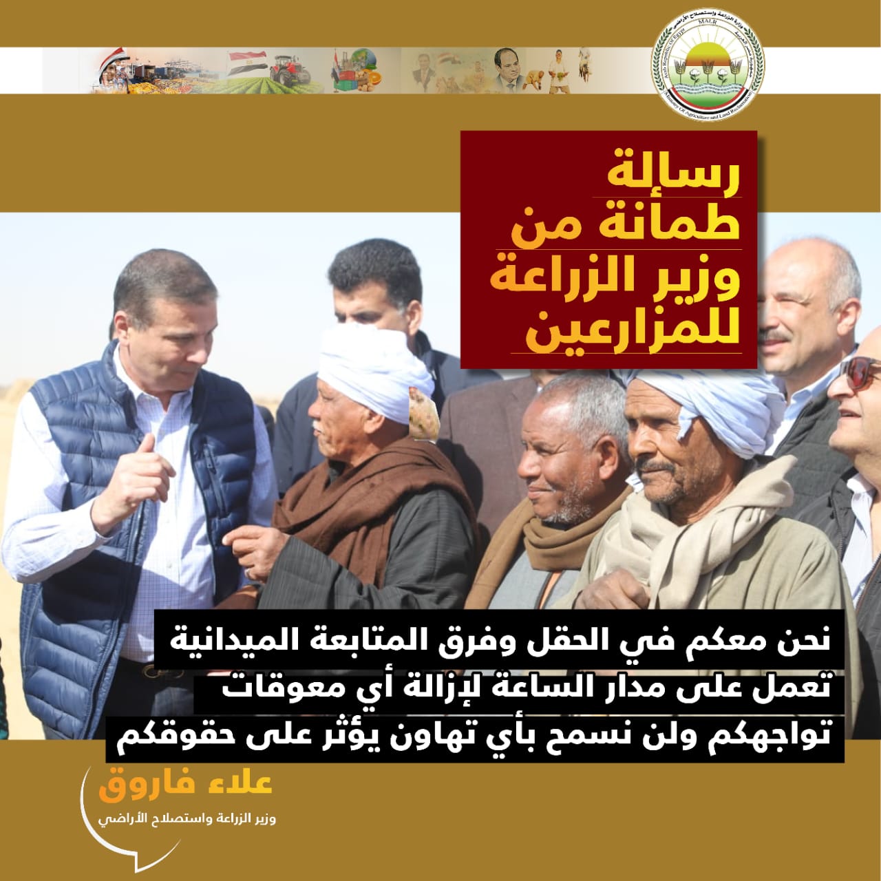 بعث علاء فاروق، وزير الزراعة واستصلاح الأراضي، رسالة طمأنة للمزارعين، قائلاً: “نحن معكم في الحقل، وفرق المتابعة الميدانية تعمل على مدار الساعة لإزالة أي معوقات تواجهكم، ولن نسمح بأي تهاون يؤثر على حقوق الفلاحين”.